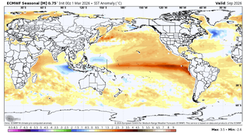 Looking also at the latest NMME multi-model forecast for late summer and fall, you can already see a clear El Niño warm anomaly in the Pacific. This also shows the strength of peak anomalies to reach or exceed the threshold for a Super El Niño event in 2026/2027.
