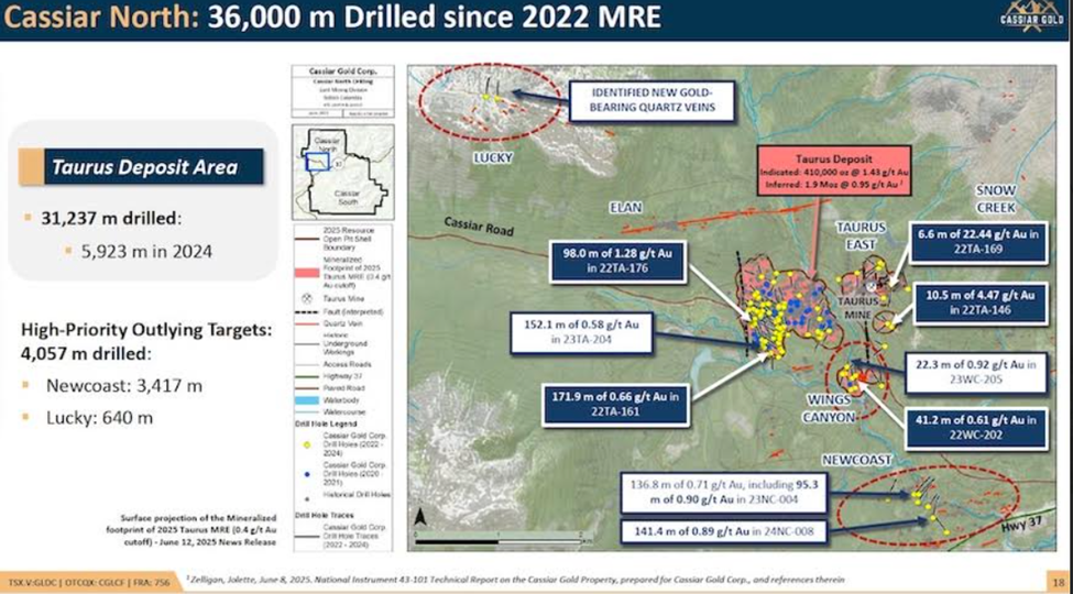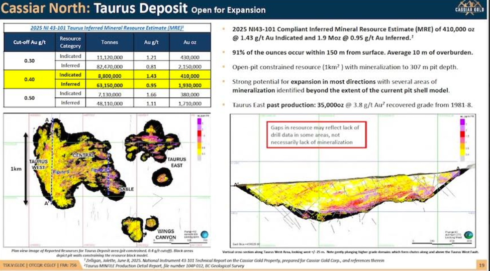 As mentioned, Cassiar North hosts an NI 43-101 Inferred resource of 0.4 Moz gold at 1.43 g/t gold Indicated and 1.93 Moz gold at 0.95 g/t gold Inferred at the Taurus deposit. This is using a 0.40 g/t Au cut-off.