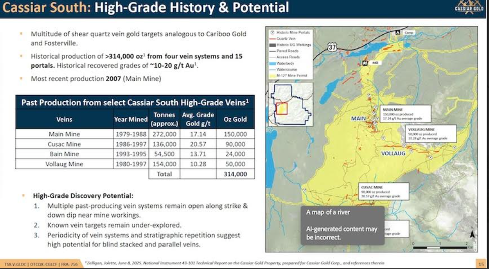 At the Cassiar South project area, there are many known veins with only minimal drilling. Several underground mines operated from 1997-2007. They collectively produced >315,000 oz gold extracted from high-grade quartz vein mineralization (four vein systems and 15 portals) with grades of 10-20 g/t Au. The most recent production was in 2007 from the Main mine.