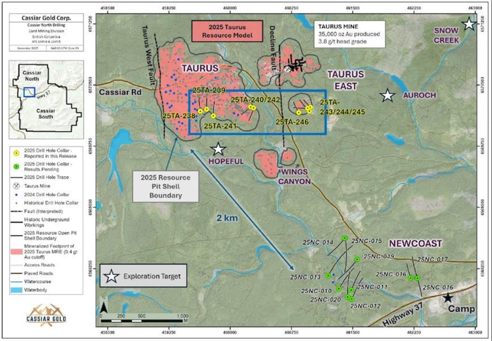 Figure 1. Cassiar North 2025 drill campaign drill hole location plan map of expansion and exploration drilling at the Taurus deposit and Newcoast prospect, with locations of drill holes reported within this news release contained within the blue outline