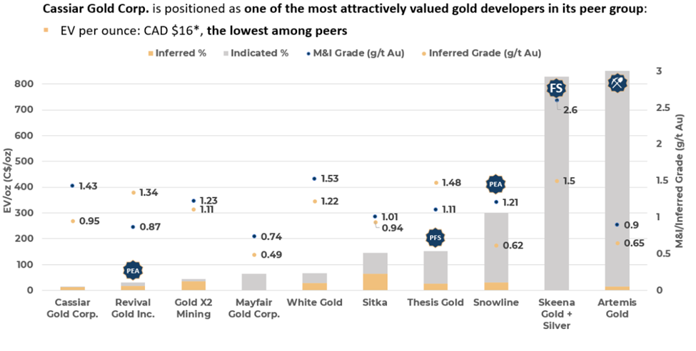 We can see Cassiar Gold’s challenge in the below peer comparison chart. The companies on the horizontal axis are ranked according to their enterprise value per ounce in CAD$, on the left vertical axis, and their Measured and Indicated/Inferred grade, on the right vertical axis.