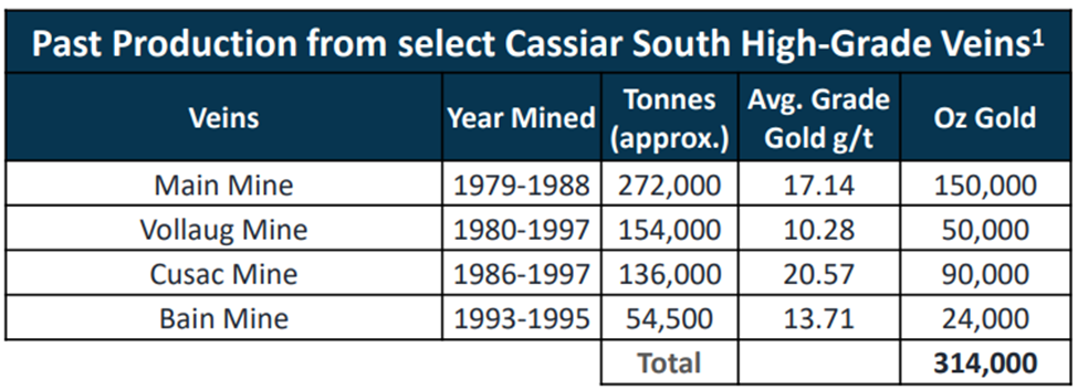 The Cassiar South project area hosts several past-producing high-grade gold mines that targeted high-grade quartz vein mineralization grading between 10-20 g/t gold. Past production totaled 314,000 oz gold, with most of it extracted from the high-grade quartz veins.