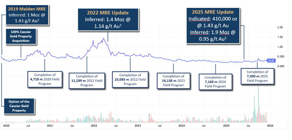 The market cap currently stands at CAD$46 million with 146,659,300 shares outstanding. GLDC has $8.7 million in cash and deposits as of August 2025.