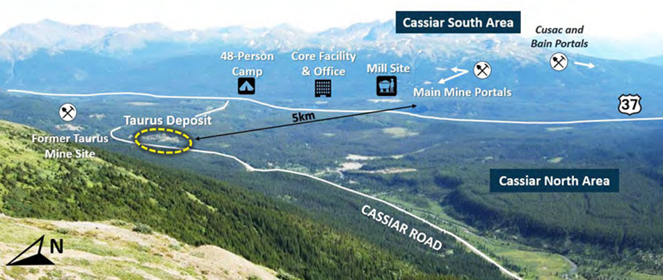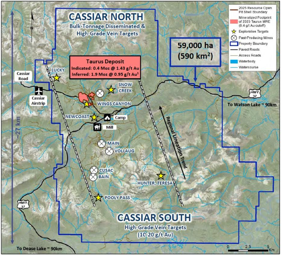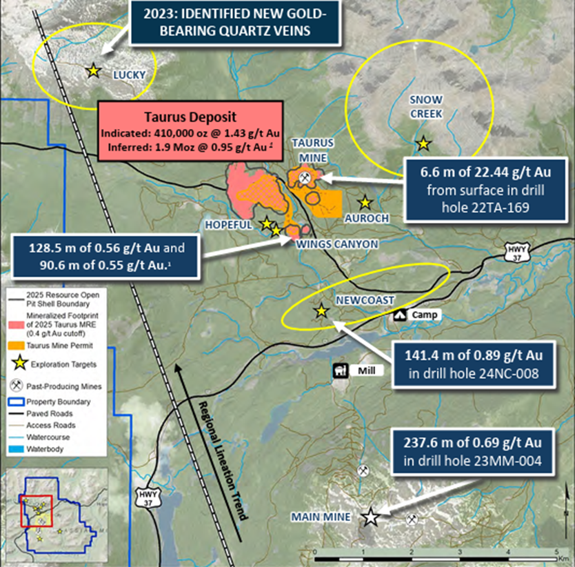 The Cassiar North project area hosts the Taurus deposit as well as multiple similar bulk-tonnage-style regional targets including the Newcoast, Auroch, Hopeful, Snow Creek, and Lucky prospects, among others.