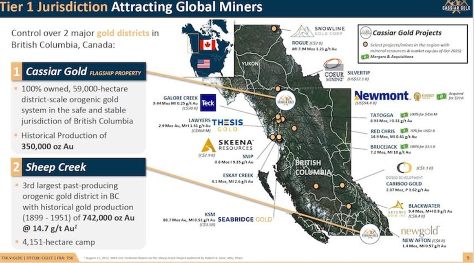 The Cassiar Gold District is located on BC’s inland orogenic gold belt with other known districts such as the Cariboo-Barkerville District and the Sheep Creek District.