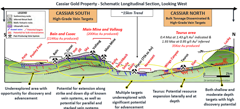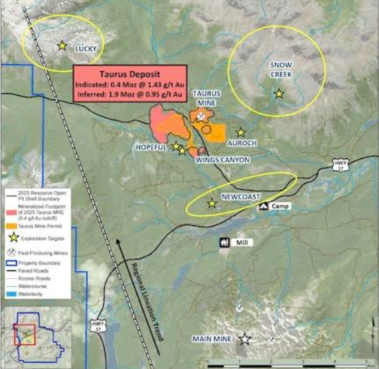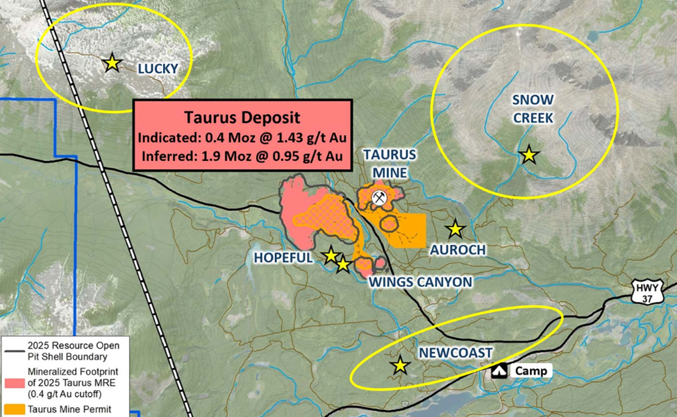 The Cassiar North project area hosts the Taurus deposit as well as multiple similar bulk-tonnage-style regional targets including the Newcoast, Auroch, Hopeful, Snow Creek, and Lucky prospects, among others.