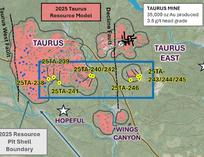 Drilling at the Taurus deposit continues to demonstrate potential for ongoing expansion of near-surface mineralization along the main east-northeast striking sheeted vein sets than defined by the 2025 mineral resource estimate.