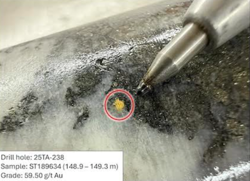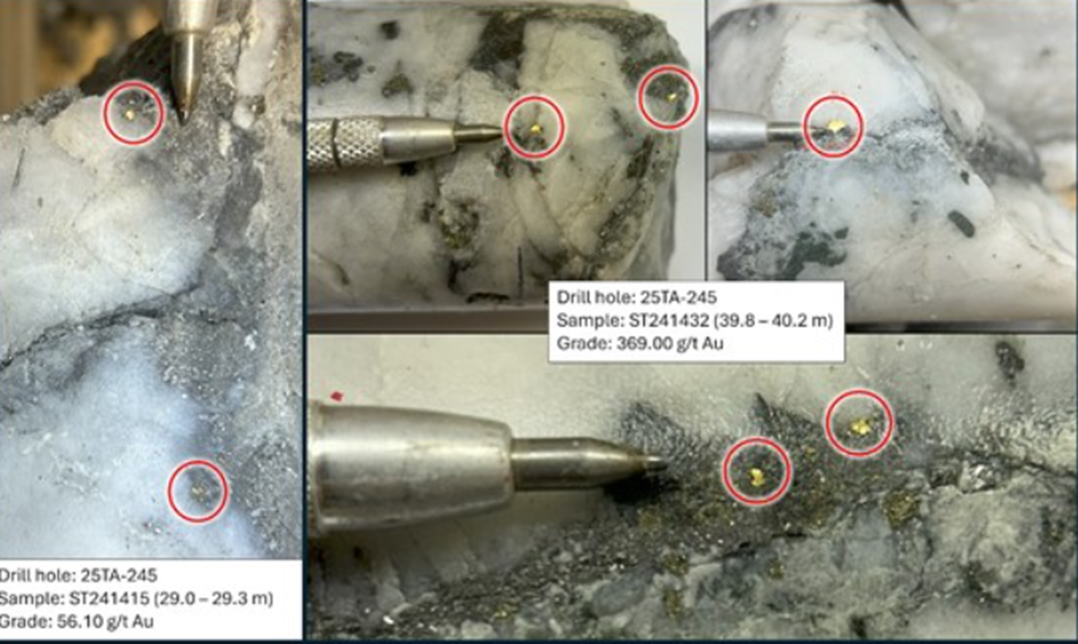 The reported drill holes increase the population of high-grade, visible gold-bearing veins at the deposit, such as drill hole 25TA-245 which delivered 0.3m grading 56.10 g/t Au and 0.4m grading 369 g/t, and hole 25TA-238 with 59.50 g/t over 0.4m, nested in broader intercepts.