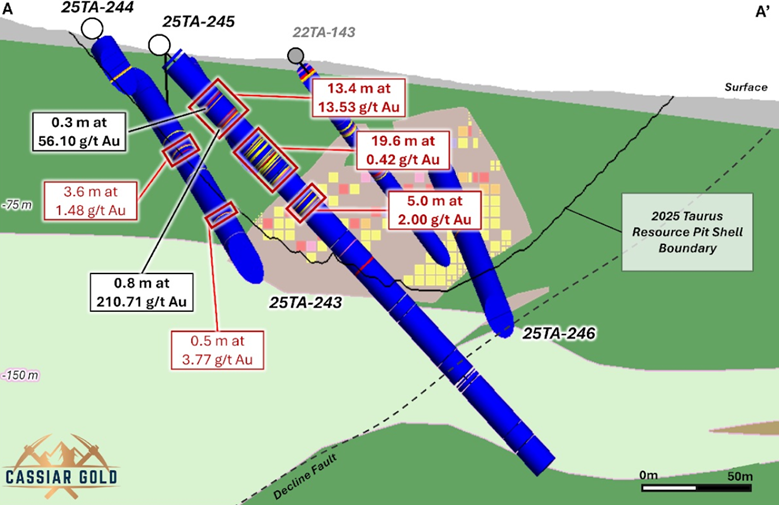 The highlight intercept was from drill hole 25TA-245 at Taurus, which encountered multiple quartz veins with visible gold, returning 13.4m of 13.4 g/t Au from 28.2m downhole, including 56.10 g/t Au over 0.3m and 210.71 g/t Au over 0.8m, with 0.4m of 369.00 g/t Au.