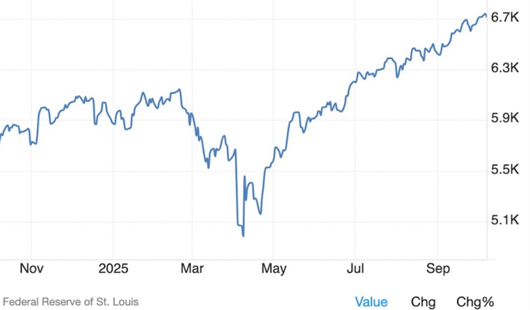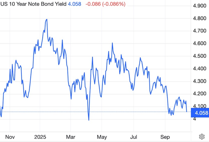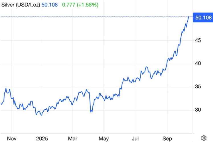 Interest rate cuts are a tailwind for precious metals. Gold is up over 50% year to date, surpassing $4,000 an ounce for the first time this week. Silver had done even better, rising 70%. On Thursday silver breached $50 for the first time since 1980.