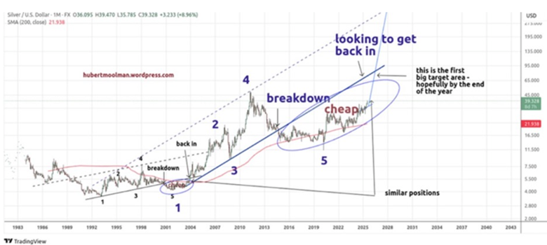 Precious metals analyst Hubert Moolman posted a Silver/ US Dollar chart dating from 1983. He says that based on the fractal in the chart (a fractal is a pattern of five consecutive price bars that signals a potential trend reversal or continuation), “it is expected that we are now likely in a sustained silver rally similar to 2010-2011, for example.” Silver hit a then-record high of $49.51 in April 2011.