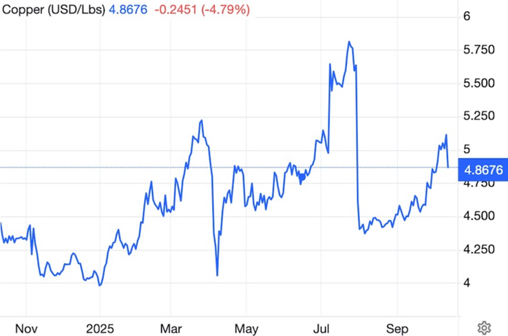 Gold is up 51% year to date and reached a record-high $4,059/oz on Oct. 8, silver is doing even better at a YTD increase of 70%, palladium is up 59%, and platinum has gained 76%. Copper is up 24%, currently trading at $4.86/lb and continues its climb from $2/lb in 2016, having recently spiked to $5.80/lb.