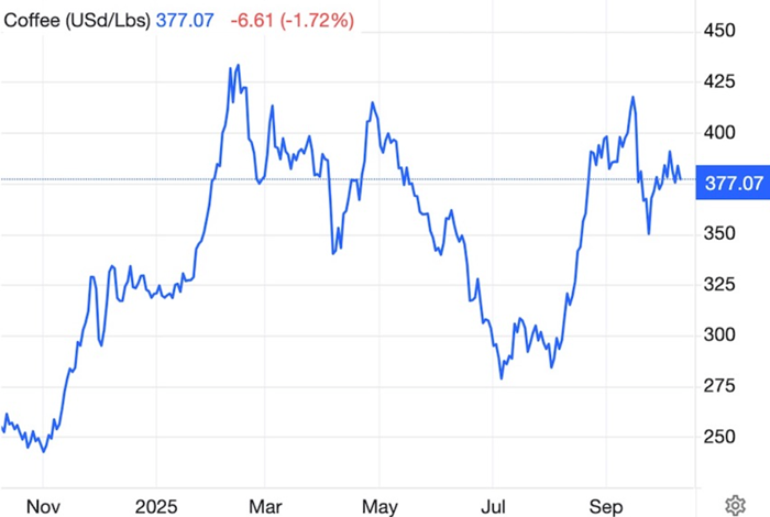 The chart below shows Arabica coffee futures hovering near their highest level since mid-September.