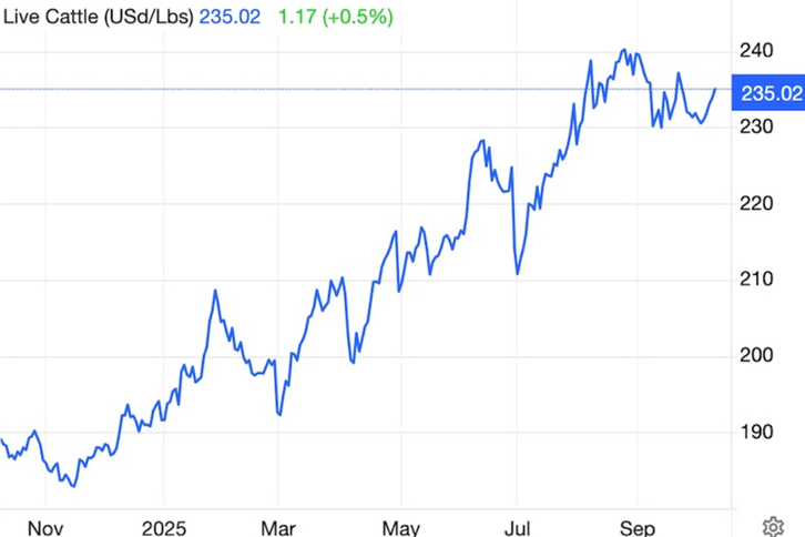Over the past month, the price of live cattle has risen 1.67%, but it’s the year-on-year number that is the headline grabber: +24.27% according to Trading Economics.