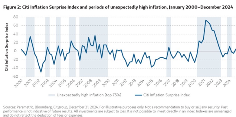 We believe the reason for the leadership of commodities in this environment is twofold: First, higher-than-expected inflation is often associated with strong underlying growth in the economy, which drives demand for raw materials and puts upward pressure on commodity prices. Second, food and energy consumption are large components of the Consumer Price Index (CPI), so it follows that rising prices in those categories would be reflected in corresponding futures contracts.