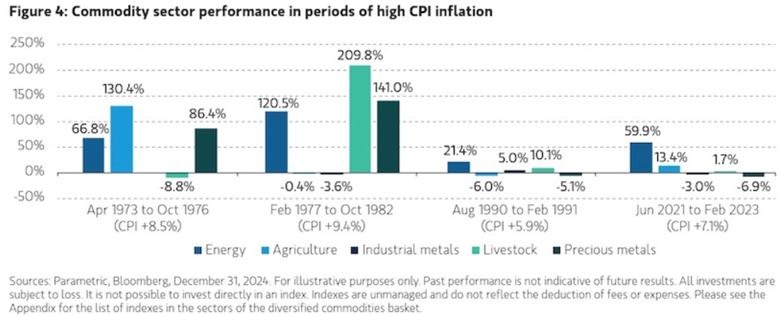 According to Morgan Stanley, when inflation is higher than expected, history shows that commodities often outperform both equity and fixed income investments.