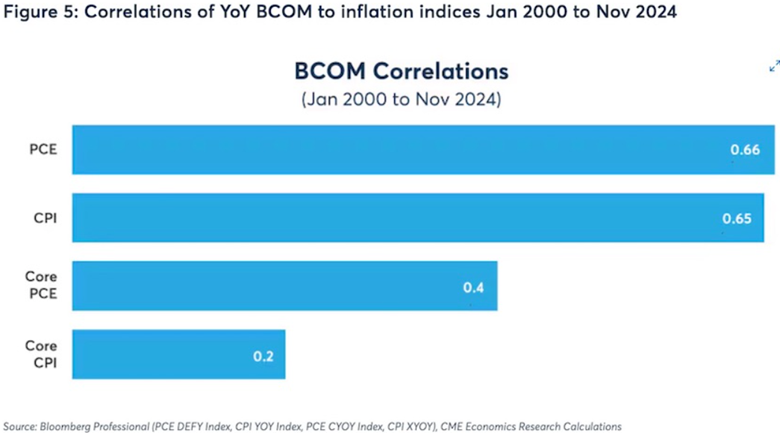 A third source, CME Group, says The data suggests commodity prices (BCOM) have a relatively high positive correlation to the PCE index, and to the PCE’s nondurable goods subsector. The results also show that by lagging the data for three to five months may result in a higher correlation as it takes time for the commodity price changes to find their way through the supply chain.