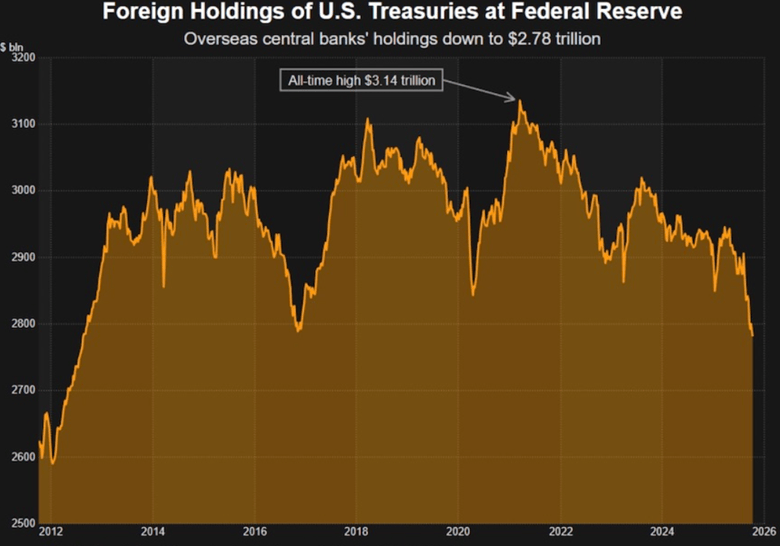 However, Reuters reported this week that The amount of U.S. Treasuries held at the New York Fed on behalf of global central banks has slumped to its lowest in over a decade, casting renewed doubt on foreign appetite for U.S. sovereign debt and other dollar-denominated assets…