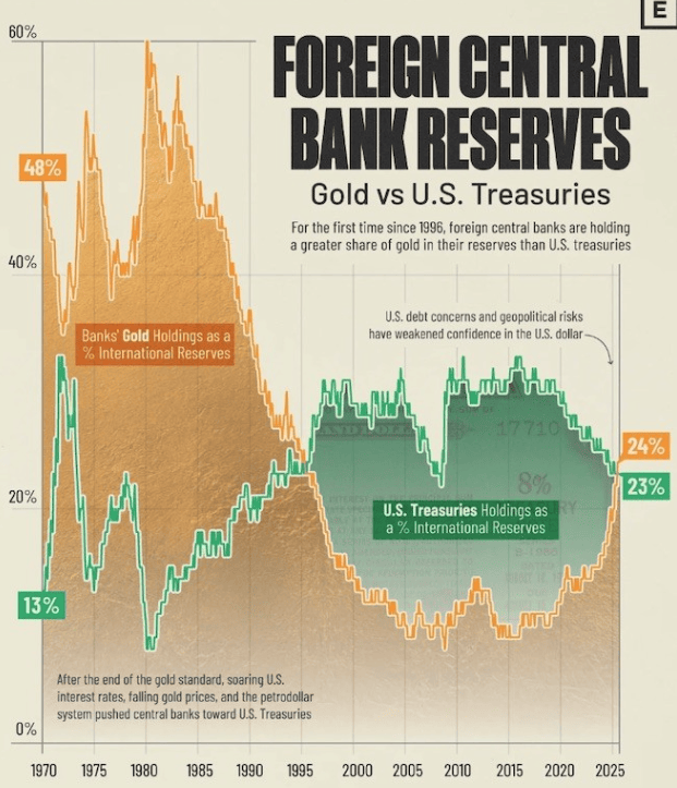 In fact, central banks now hold more gold than US Treasuries, which hasn’t happened since 1996. Visual Capitalist notes that persistent gold buying by CBs and rising US debt risks are reshaping reserve composition towards hard assets like precious metals.