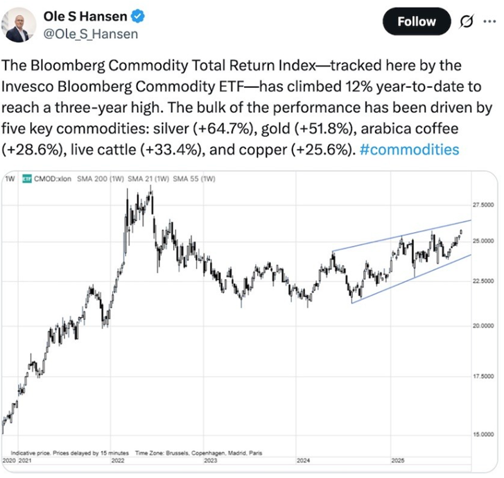 Arabica coffee and cattle are the two non-mineral commodities that Saxo Bank economist Ole Hansen says has driven the Bloomberg Commodity Total Return Index to a 3-year high.