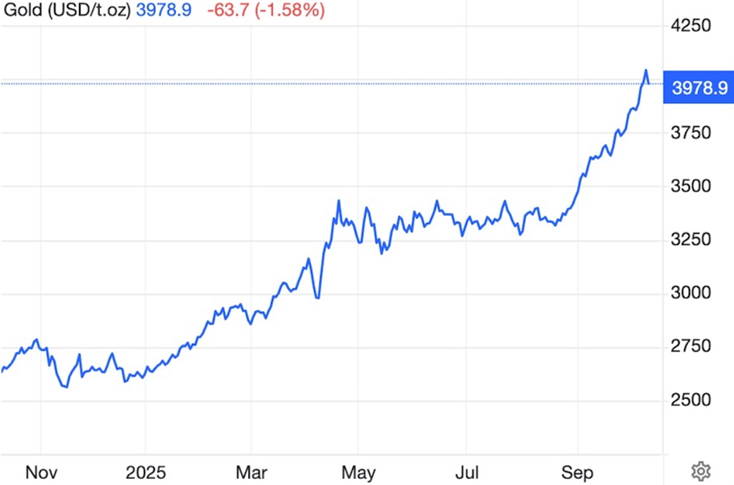 On Tuesday, Oct. 7, gold surpassed $4,000 an ounce for the first time ever, with gold futures hitting $4,011/oz. On Wednesday gold reached $4,059/oz but it has since slipped back below $4,000.