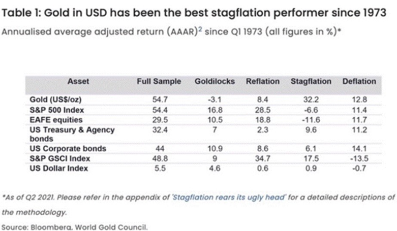 In fact, gold outperforms other asset classes during times of economic stagnation and higher prices. The table below shows that, of the four business cycle phases since 1973, stagflation is the most supportive of gold, and the worst for stocks, whose investors get squeezed by rising costs and falling revenues. Gold returned 32.2% during stagflation compared to 9.6% for US Treasury bonds and -11.6% for equities.