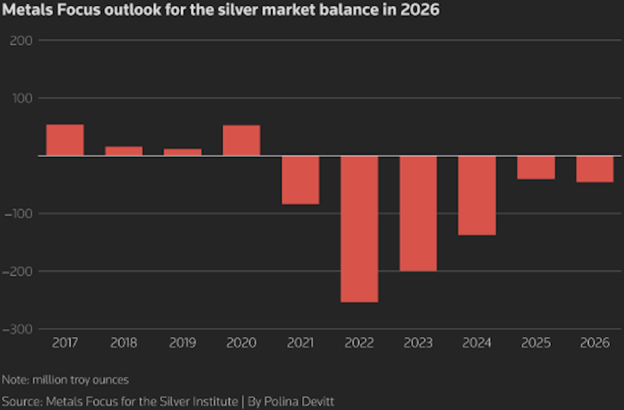 As for the 2026 outlook, Reuters reported last week that industrial demand for silver is seen down 3% to 640Moz, but coin and bar demand should rise by 18% to 258Moz.