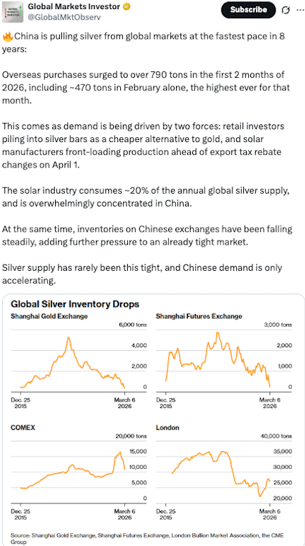 Beijing is reportedly pulling silver from global markets at the fastest pace in eight years.