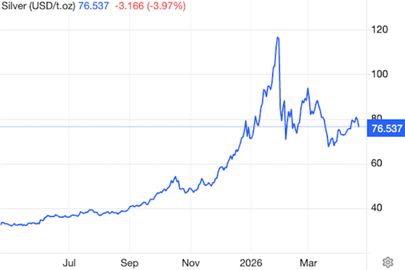 It notes silver used in jewelry, electronics, EVs, solar panels, and for investment, is down 35% following a 147% surge in 2025 and driving prices to a record-high $121 an ounce in January.