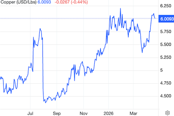 Copper has been volatile for the duration of the now seven-week war in Iran, falling as low as $5.33/lb on March 20 before rebounding to the current $6.00 as investors stayed cautious ahead of further US-Iran peace negotiations.
