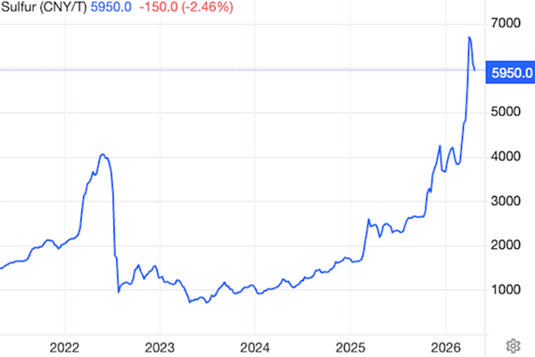 With much of the world’s sulfur supply trapped in the Persian Gulf, sulfur prices have reached record highs — approaching 7,000 Chinese yuan per tonne on March 30 before slipping back to the current 5,950.