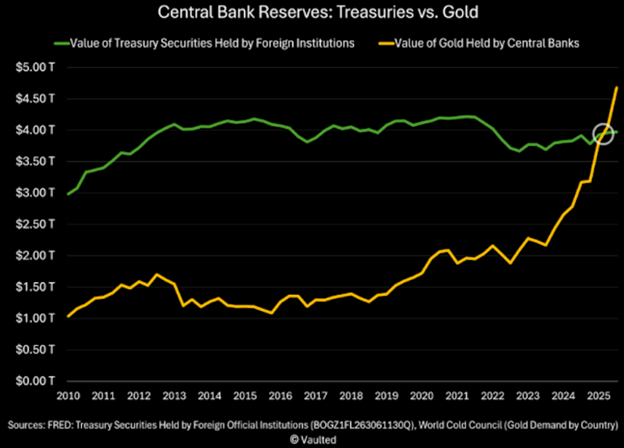 In the 2010s, Treasuries made up more than 30% of central bank reserves. That number has now dropped to 23%, while gold’s share has risen to 27%. In each of the last three years, central banks have collectively purchased over 1,000 tonnes of gold (double the annual average from the previous decade), states Vaulted.