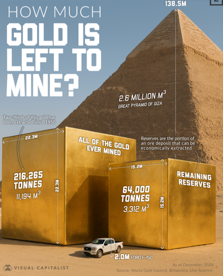 A November 2025 infographic finds roughly 216,000 tonnes of gold have been mined, with about 64,000t left underground.
