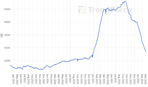• Because mine output and recycling combined still fail to meet demand, the gap is primarily filled by clearing out global exchange-traded products (ETPs) and COMEX warehouse stocks.