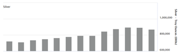 • 70 to 75% of silver is produced as a byproduct of lead, zinc and copper mining, meaning miners can’t easily increase silver production in response to higher prices.