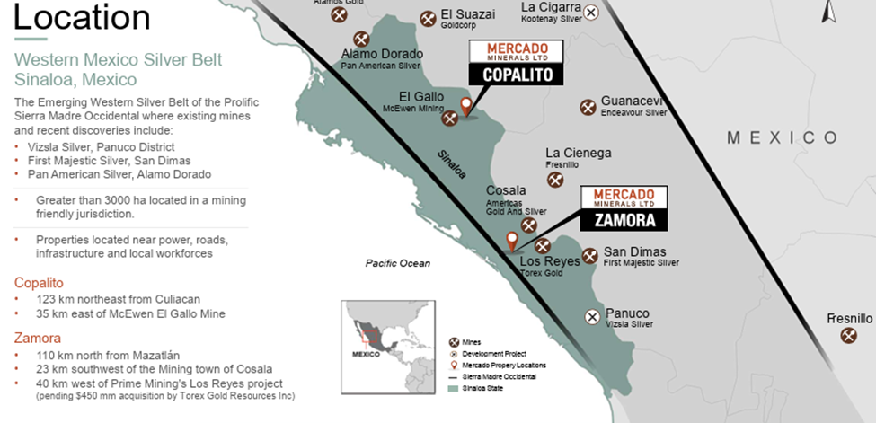 Mercado Mineral’s’ (CSE:MERC) properties, Copalito and Zamora, are located within the Western Mexico Silver Belt in Sinaloa state, Mexico. The properties are near power, roads, infrastructure and local workforces in a mining-friendly jurisdiction. This emerging belt of the prolific Sierra Madre Occidental mountain range, which hosts existing mines and recent discoveries, includes: