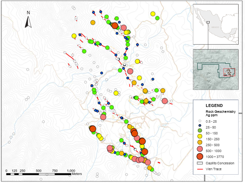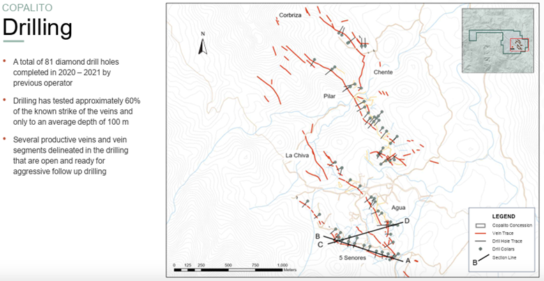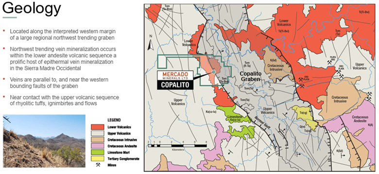 According to Mercado, their flagship Copalito Project presents a district-scale opportunity with known and drilled silver — gold-low-sulfidation vein mineralization that is open for expansion. Historical third-party high-grade silver and significant gold and base metal drill intercepts include 347 g/t silver, 0.22 g/t gold, 0.18% lead and 0.38% zinc over 13.10 meters at the 5 Senores Vein; and 125 g/t silver, 2 g/t gold, 0.34% lead and 0.58% zinc over 23m at the El Agua Vein.