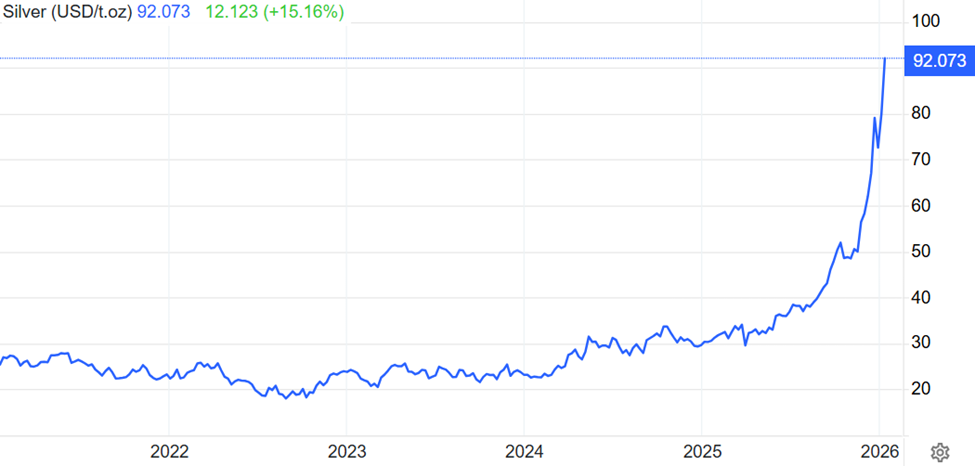 And silver’s supply is “structurally inelastic,” meaning that silver’s production structure cannot easily increase in response to higher silver prices alone.