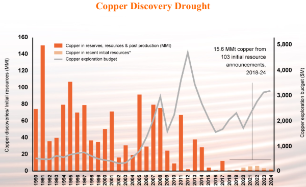 There has been a dearth of new copper discoveries in recent years, and the grades of existing copper mines are dropping, which, when added to operational misses, are making the current, and future, supply problem worse.