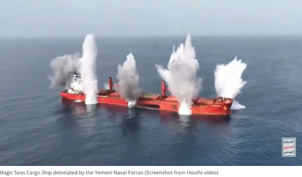 According to Naval News, Houthi rebels attacked the Greek-operated bulk carrier Magic Seas in the Red Sea using a coordinated multi-asset assault that included eight high-speed boats, unmanned surface vessels (USVs), and rocket-propelled grenades (RPGs).