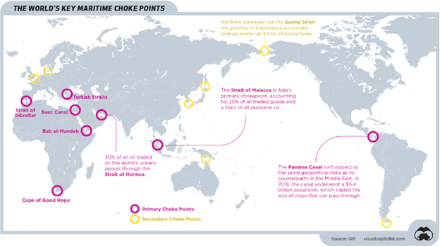 By now we are all familiar with the Strait of Hormuz and the Bab-el-Mandeb Strait. Visual Capitalist published an infographic showing these important trade routes and others, including the Suez Canal, the Panama Canal, the Strait of Malacca, the Strait of Gibraltar, the Turkish Straits, and the Cape of Good Hope. Not included on the map, but equally as important, are the Taiwan Strait and the Scarborough Shoal, both of which are vulnerable to blockades by China.