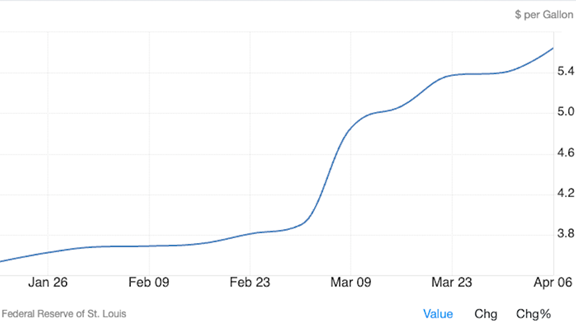 In the US, diesel is currently $5.64 a gallon, compared to $3.53/g in January — not far from the record-high $5.81 reached in June 2022.