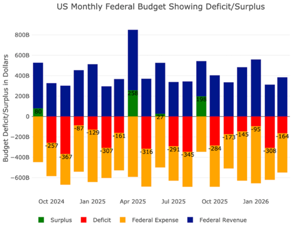 The chart below courtesy of SchiffGold shows that the last three months all saw deficits, with five of the last six months showing a deficit of more than $100 billion.
