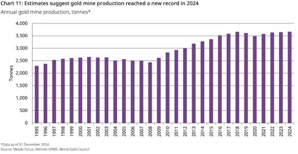 The latest full-year World Gold Council report  shows a 1% increase in total gold supply in 2024, compared to 2023, 4,974.5 tonnes versus 4,945.9t. In fact, gold supply in 2024 surpassed the record reached in 2018.