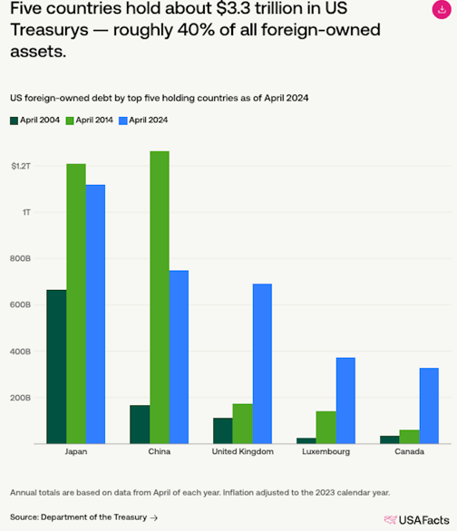 As of April 2024, foreign countries owned approximately $7.9 trillion in Treasuries — or 22.9% of total US debt. The top two debt holders were/are Japan ($1.1 trillion) and China ($749 billion). The next three biggest holders were the UK, Luxembourg and Canada. (USAFacts).