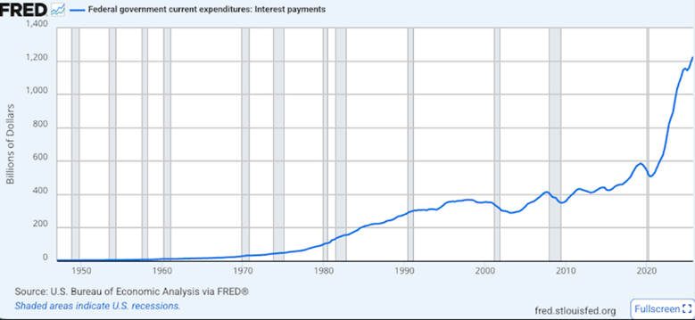 America reportedly borrowed $43.5 billion a week in the first four months of the fiscal year, which starts in October. The interest on that debt works out to over $1 trillion for 2026. Interest in 2024 and 2025 also exceeded $1 trillion.