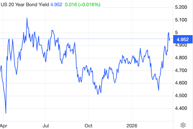 The 20-year yield returned to the 5% level on Monday, though it has since slipped below that threshold.