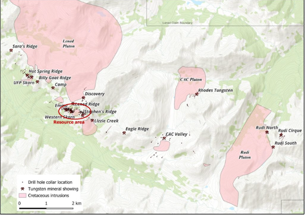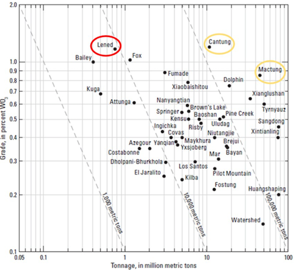 The review of the files to date has shown a quality dataset that is confirming a robust deposit with high-grade open pit potential. The historical resource estimate by Union Carbide was calculated for only three of the 15 tungsten occurrences on the Lened property and ranks as one of the highest-grade tungsten skarn deposits in the world according to the US Geological Survey (USGS). As mentioned, Lened/ Lentung is located in a region hosting world-class tungsten deposits including the past-producing Cantung mine and the Mactung deposit (Figure 1).