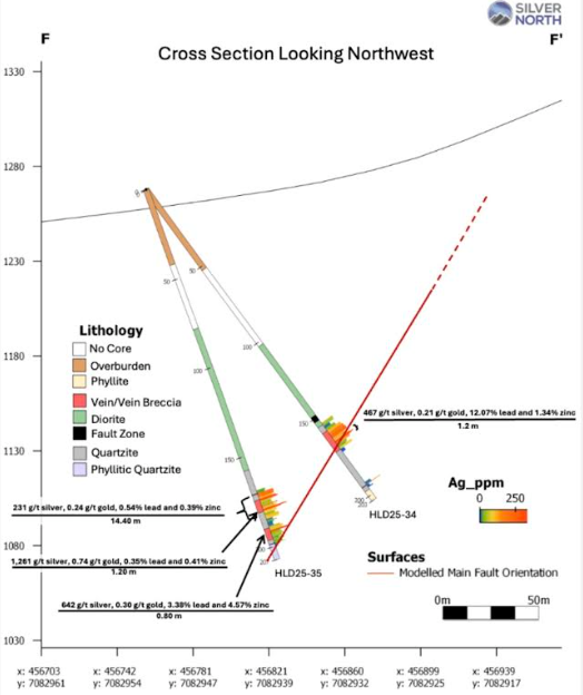 Results include 1.25 meters averaging 1,261 g/t silver, 0.74 g/t gold, 0.35% lead and 0.41% zinc starting at 179.5m, within a larger 14.4-meter intersection of 231 g/t silver, 0.24 g/t gold, 0.54% lead and 0.39% zinc starting at 170.6m in hole HLD25-35.