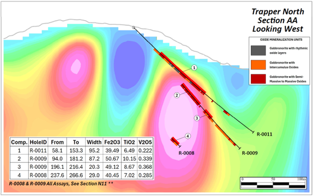 The drilling in Q4 2025 at Trapper North forms part of the Company’s broader strategy to advance toward a maiden Mineral Resource Estimate for the Radar Project. The economic target is the large, continuous sections of oxide mineralization (semi-massive to massive VTM and ilmenite layers) that demonstrate consistent and exceptional grades in titanium, vanadium, and iron—critical minerals for North American supply security needed in defense, aerospace, renewable energy, and steel production.